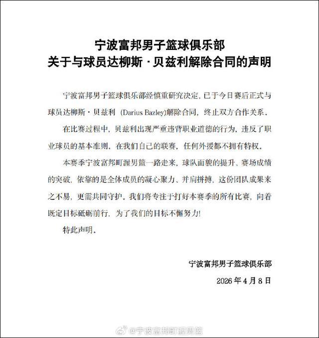 赛后,宁波男篮发布声明,宣布与球员达柳斯·贝兹利解除合同的声明。